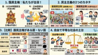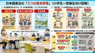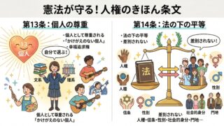 中学公民の重要単語「基本的人権」と「個人の尊重」をわかりやすく解説。憲法13条の内容や14条の「法の下の平等」、差別と区別の違い(女性専用車両など)までスッキリ理解。ユニバーサルデザインの豆知識や入試頻出の記述対策まで網羅した、決定版記事です。