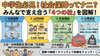 財政と国民の福祉社会保障の仕組み~人生の「まさか」を支える最強の味方!~ 社会保障制度の「4つの柱」を中高生向けにスッキリ解説!憲法25条の生存権から、社会保険・生活保護の仕組みまで。深刻な財政圧迫や、不正受給・受給拒否といった現代の矛盾、テストに出る記述対策まで盛り込んだ完全ガイドです。 2026.02.11公民私たちの暮らしと経済財政と国民の福祉