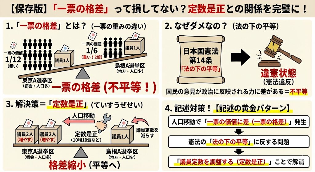 テストで「一票の格差と定数是正の関係を説明しなさい」と言われたら、次の3ステップで書きましょう!