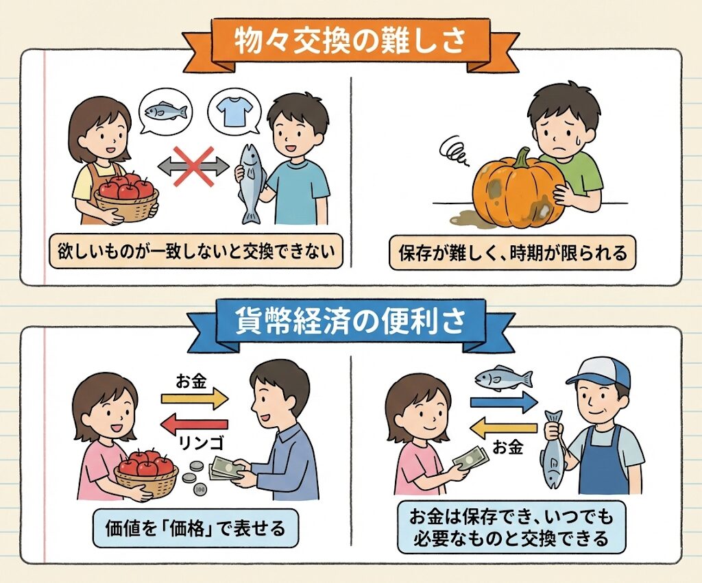【問1】 貨幣ができる前に行われていた、モノとモノを直接交換する方法を何といいますか。