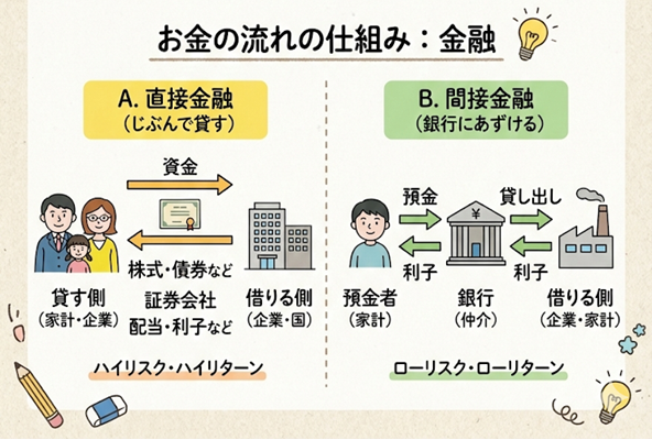 | 間接金融 | 銀行が預金者からお金を集め、それを企業に貸し出す。 | 銀行が「仲介役」になる。 |