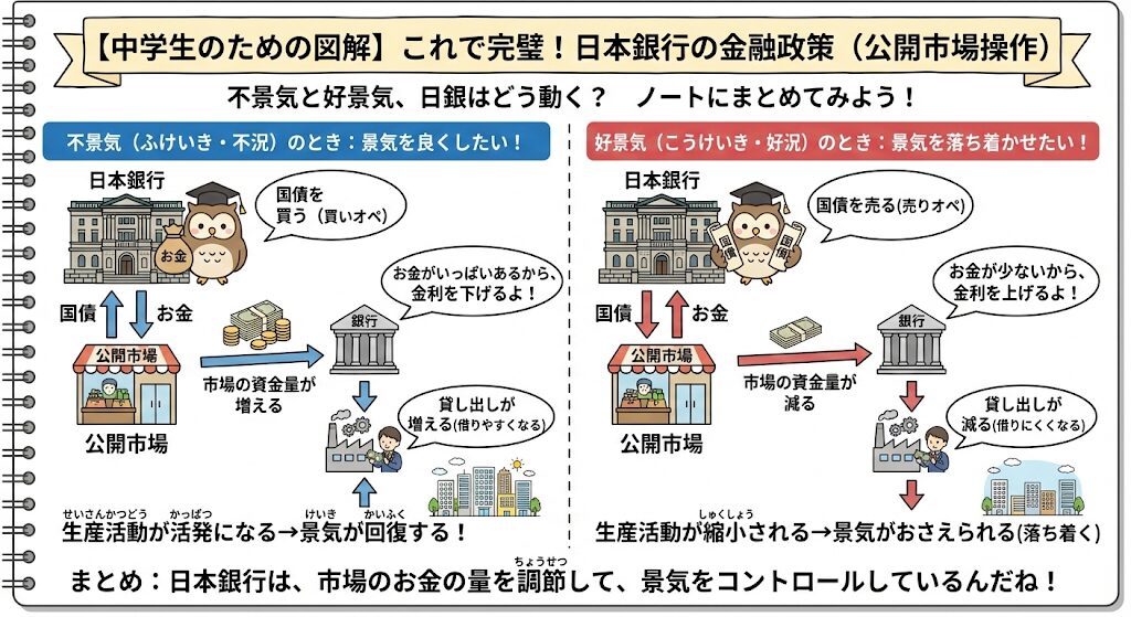 - 結果:銀行にお金が余るので、金利(利子)が下がる。企業がお金を借りやすくなり、生産が活発になって景気が回復へ向かう!