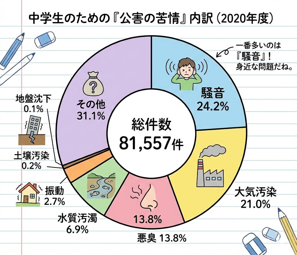 豆知識:現代で最も多い「公害」の苦情は? 地方公共団体に寄せられる苦情の中で、最も件数が多いのは「騒音」です 。かつての水質汚濁などは対策が進みましたが、私たちの生活に密接した騒音や振動、悪臭、土壌汚染といった問題は今も身近な課題として残っています 。
