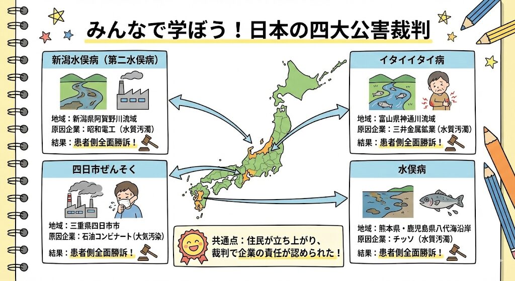 - 水俣病(熊本県):有機水銀による水質汚濁が原因 。