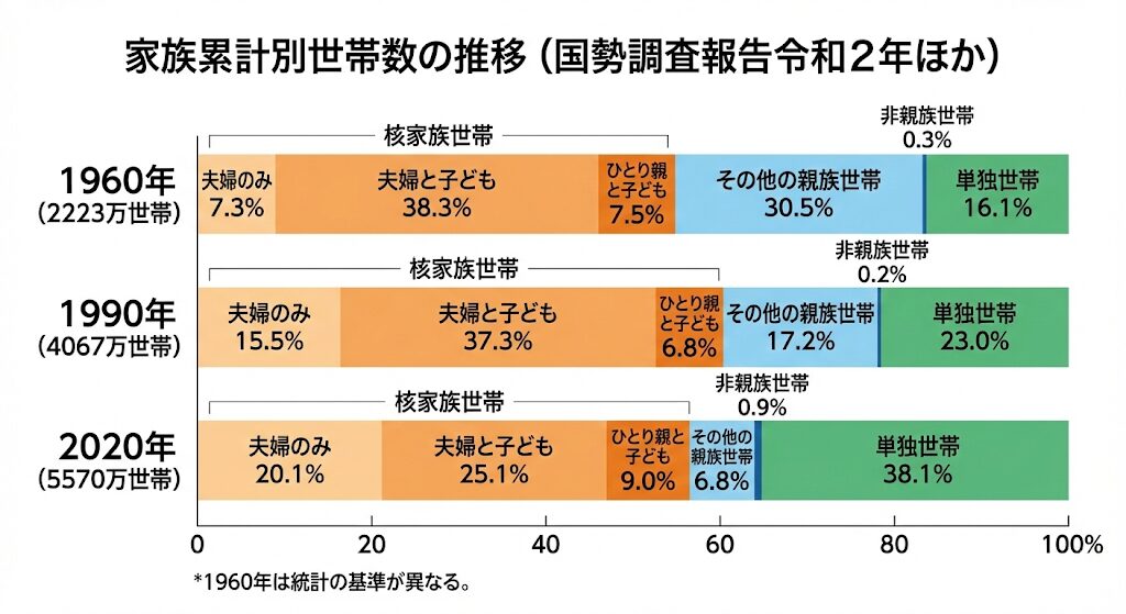 - 長寿化:おじいちゃんやおばあちゃんが長生きになり、夫婦二人だけ、あるいは配偶者を亡くした後に一人で暮らすケースが増えています。