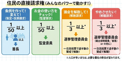 「こんな条例を作ってほしい!」あるいは「不当な仕事をしていないか調べてほしい!」という時、住民が署名を集めて要求できる権利を直接請求権といいます。