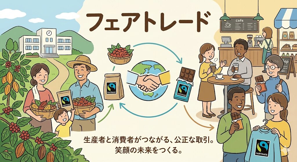 - フェアトレード(公正貿易):途上国の農作物や製品を、適正な価格で継続的に取引すること。生産者の生活を守る「思いやりの貿易」です。