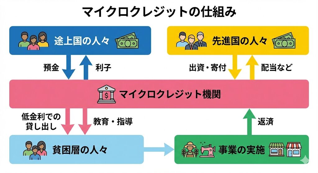 - マイクロクレジット:貧しい人々が新しい仕事を始めるために、無担保で少額のお金を貸し出す仕組みです。