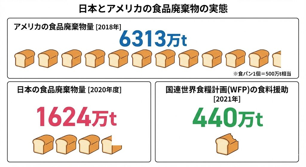 ここで衝撃的なデータがあります。 日本やアメリカの食品廃棄物(フードロス)の量は年間数百万トンにものぼりますが、国連世界食糧計画(WFP)による世界全体の食料援助の量は、その廃棄量に比べて圧倒的に少ないのが現状です。