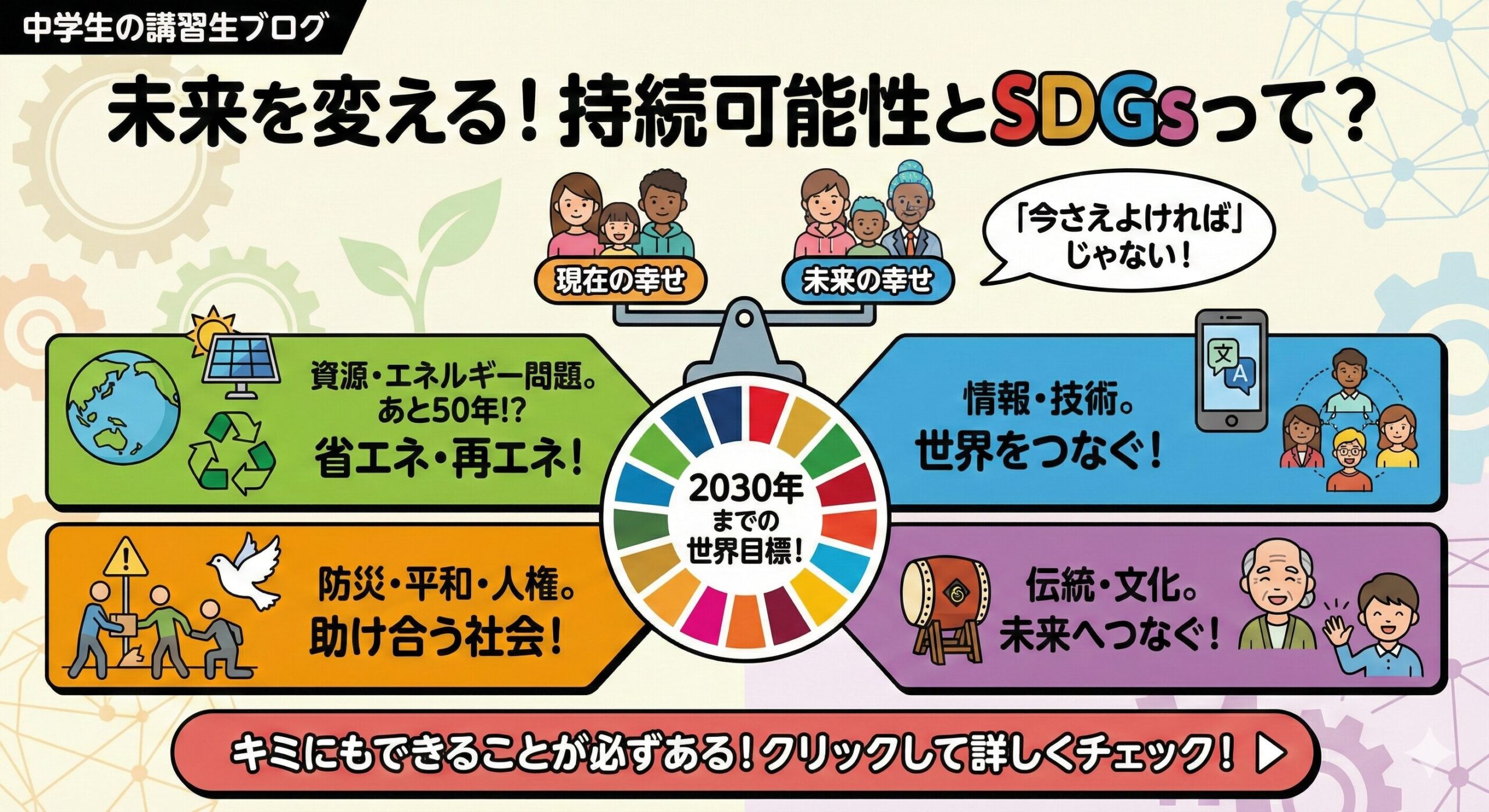 この記事では、持続可能性の意味や教科書に載っている写真から読み取れる社会的メッセージ、そしてSDGs(持続可能な開発目標)について、中学生にもわかりやすく解説します。世界の今と自分の行動がつながる大切さを、一緒に考えていきましょう!