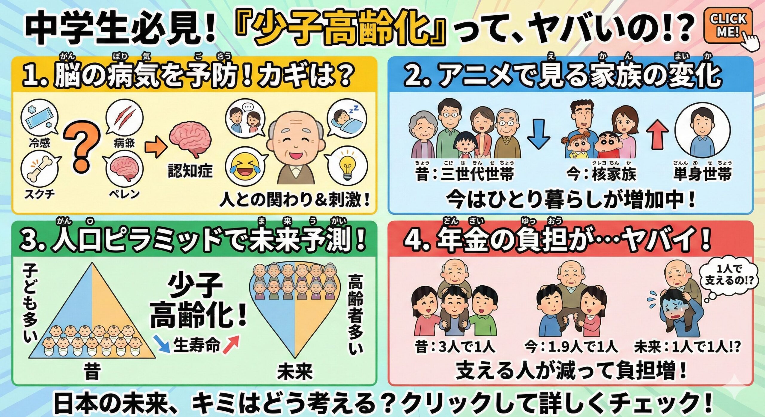 この記事では、認知症の予防や家族のかたち、人口の変化、年金問題など、少子高齢化のリアルな影響を、アニメの家族を交えて中学生にもわかりやすく解説します。