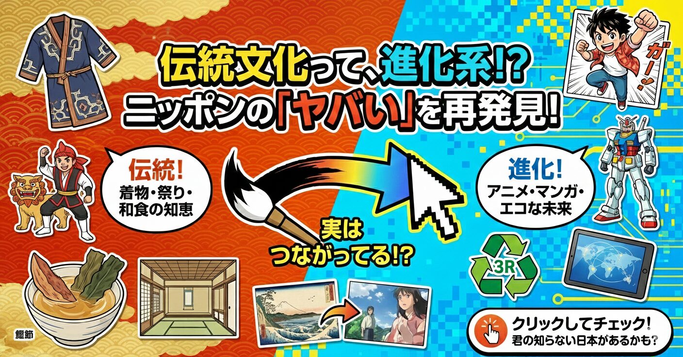 この記事では、昔から受け継がれる伝統文化と、新しく生まれる創造文化を、服装・建築・食・環境・アニメの5つの視点で中学生にもやさしく解説。クイズ・練習問題つきで、授業の復習にも自由研究にもぴったり!