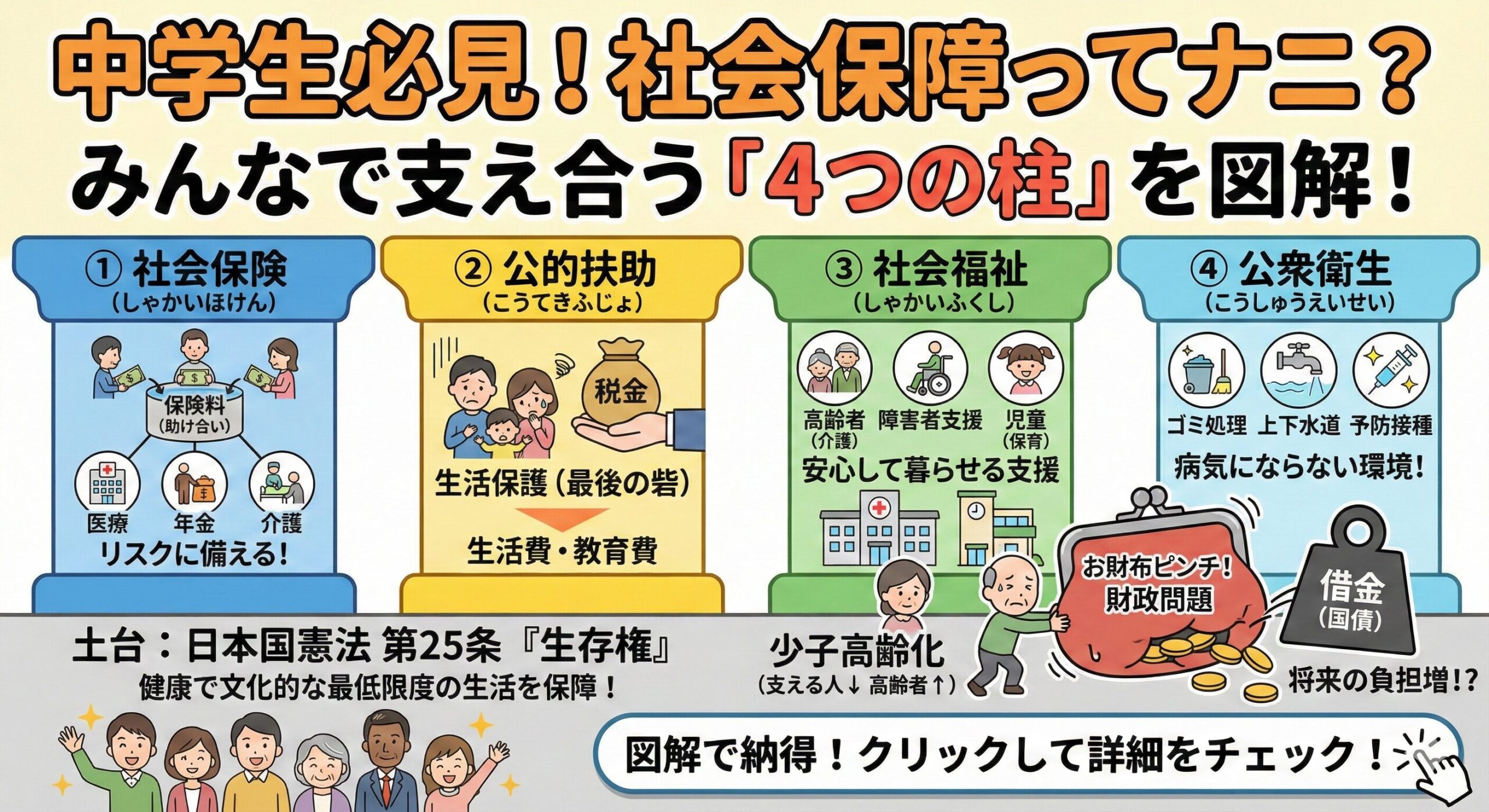 「将来、年金はもらえるの?」「病気でお金がなくなったらどうしよう」……そんな不安を感じたことはありませんか? 私たちが安心して暮らせるように、日本には「社会保障(しゃかいほしょう)」という巨大なセーフティーネットが用意されています。