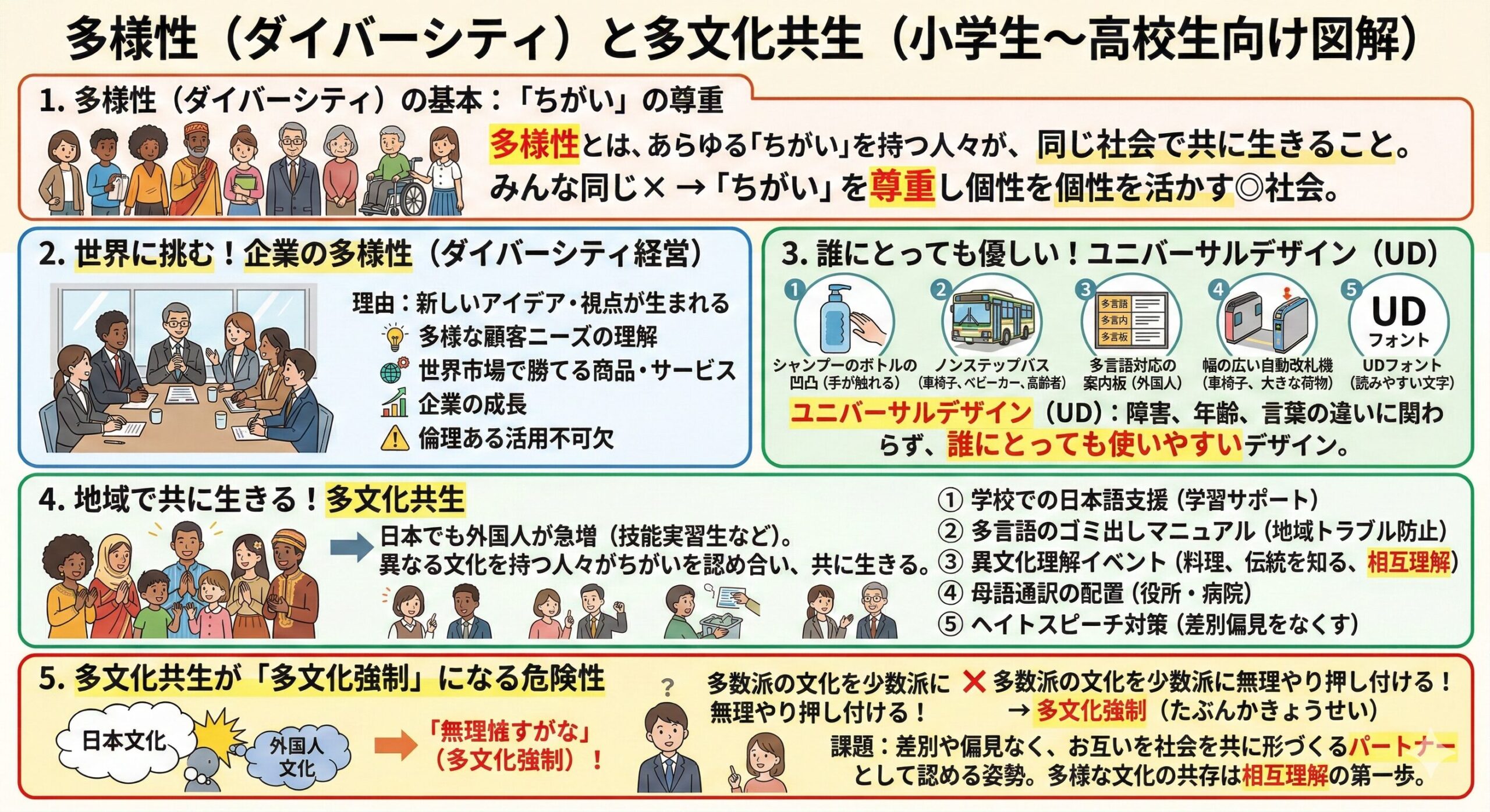 教科書では、こうした様々なちがいが共存することを多様性(ダイバーシティ)といいます。今回は、多様性がもたらすメリットや課題、そして具体的な取り組みについて、どこよりも分かりやすく解説します!