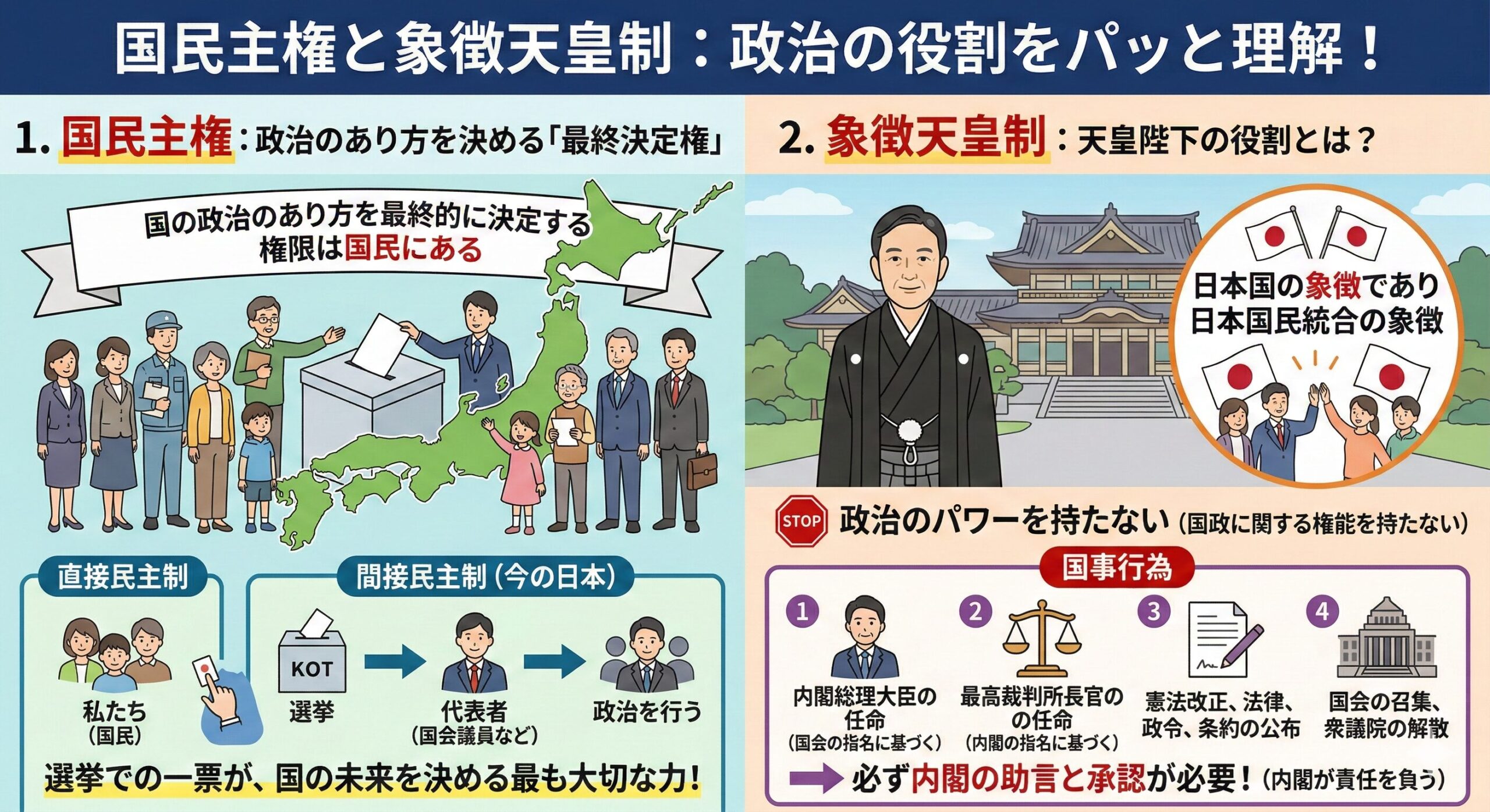 テストや入試で必ずセットで出題されるのが、国民主権と象徴天皇制です。この2つは「日本国憲法」の土台となる非常に重要な仕組みです。