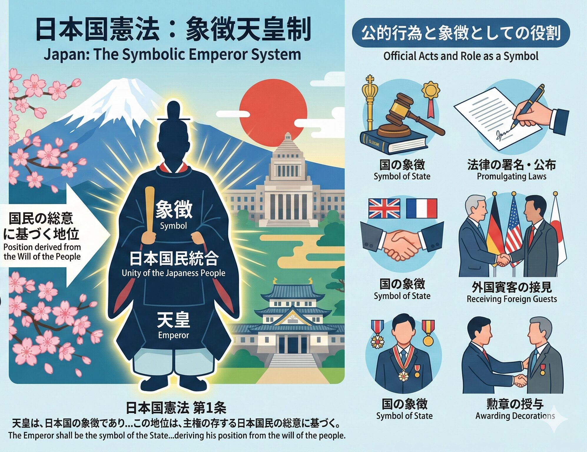 今回は、日本国憲法の第1条に定められた象徴天皇制の仕組みから、天皇陛下の具体的でハードなお仕事の内容、そしてテストの息抜きにぴったりな豆知識まで、どこよりも分かりやすく解説します!