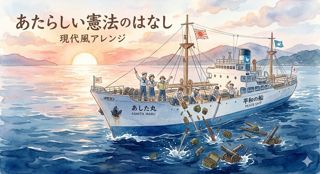 捨てられた武器の絵 終戦直後の1947年、当時の文部省が中学生向けに作った『あたらしい憲法のはなし』という冊子がありました。そこには、大きな船が鉄砲や大砲を海へドボンドボンと投げ捨てる印象的な絵が描かれています。「もう二度と武器は持たない」という当時の日本の純粋で強い決意が、子供たちに伝えられていたのです。