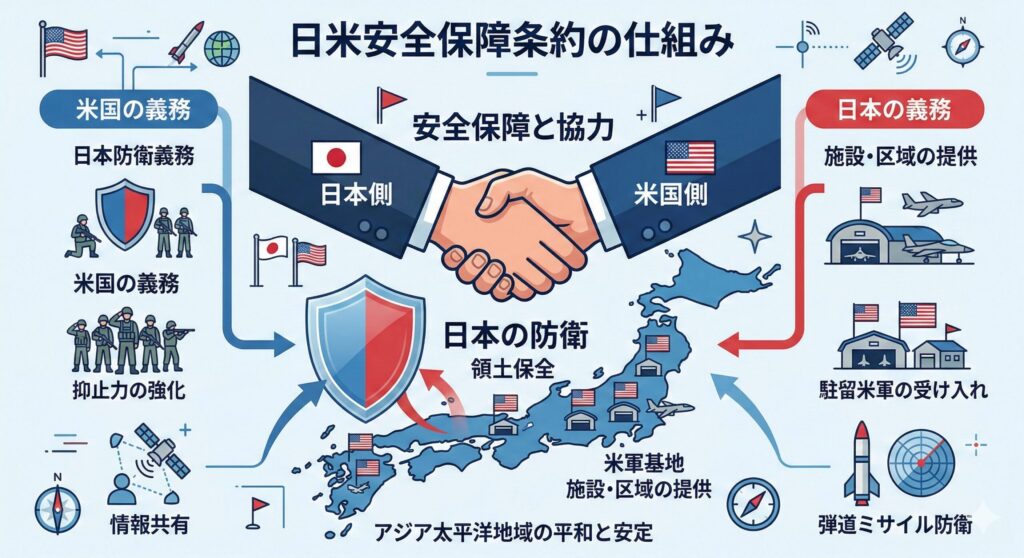 この条約は、簡単に言うと「日本は場所を貸すから、アメリカは日本を守ってね」という約束です。