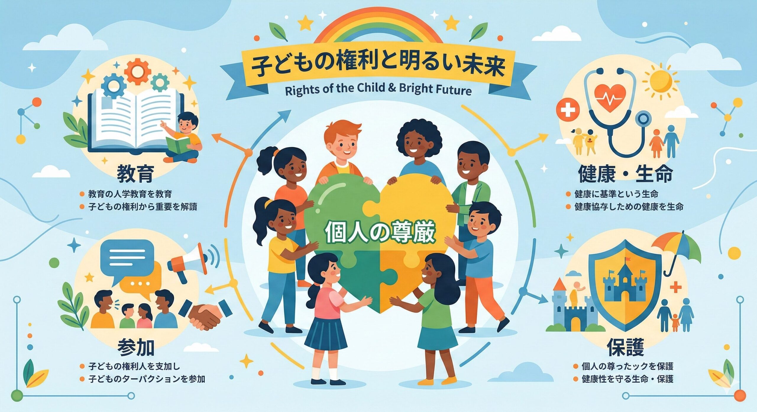 1989年に国連で採択され、日本も1994年に批准(約束)したのが子どもの権利条約です。この条約には、子どもを「保護の対象」としてだけでなく、「権利を持つ主体」として認める4つの大きな柱があります。