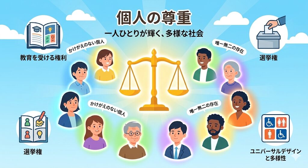 - 具体例:高校生になって「文系に進むか、理系に進むか」を自分で選べるのも、この個人の尊重があるからです。もしこれがなければ、国から勝手に「君は数学が得意そうだから理系に行きなさい」と強制されてしまうかもしれません。自分の意志で自分の生き方を選べる(幸福追求権)のは、憲法が君を「個人」として認めているからなんです。